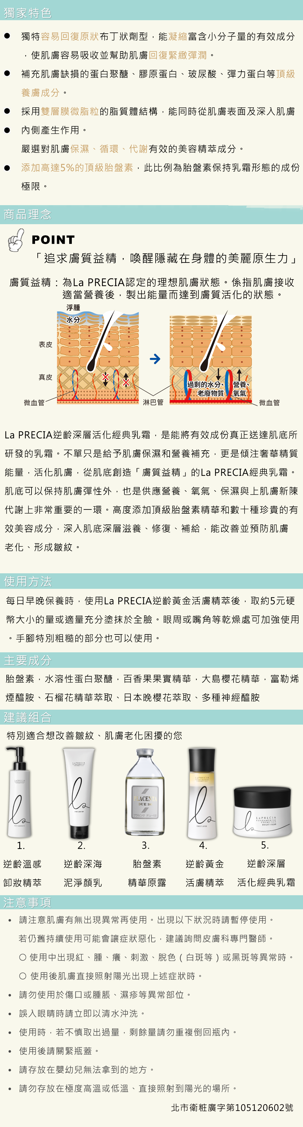 - 富含能修復肌膚缺損的蛋白聚醣、膠原蛋白、玻尿酸、彈力蛋白等的養膚成分